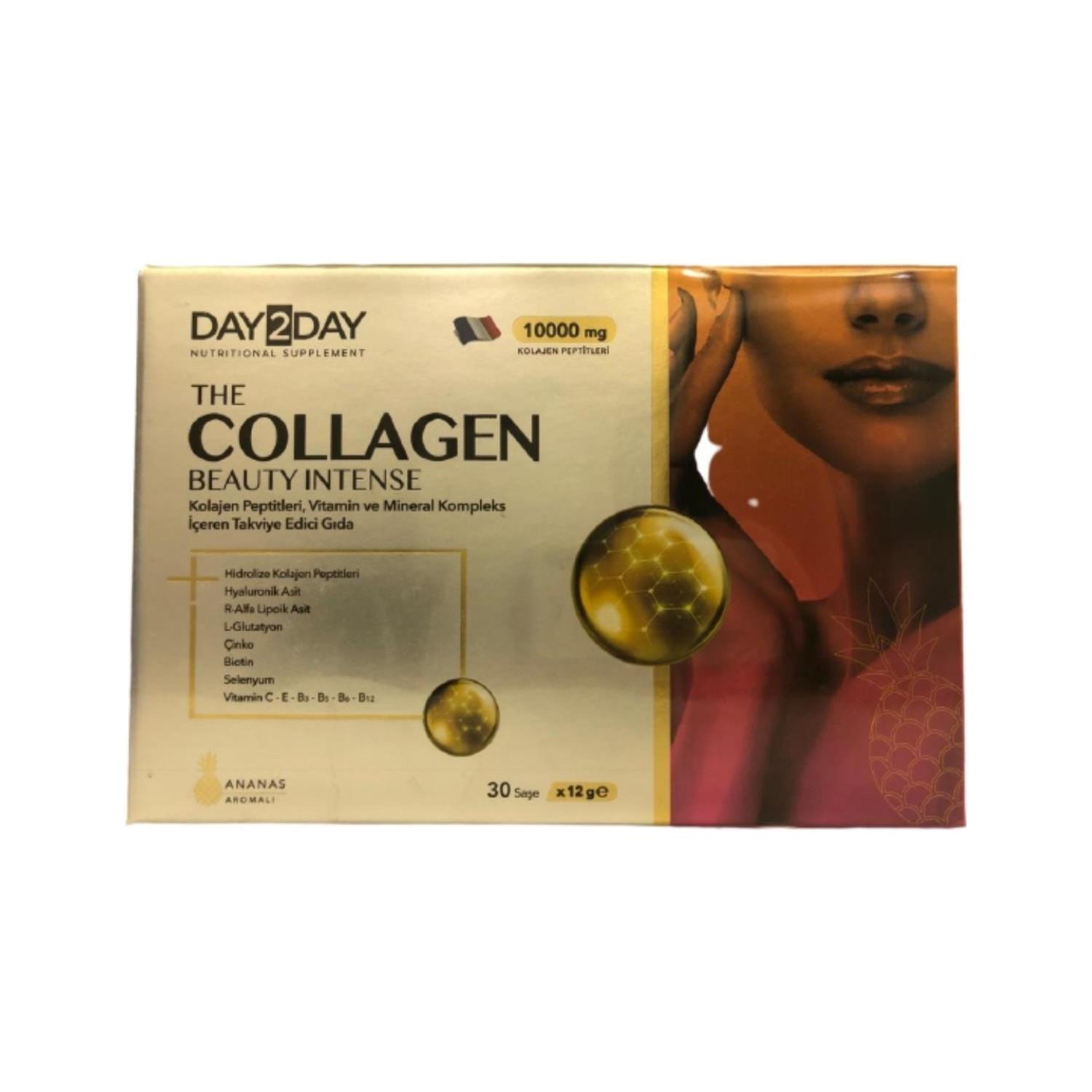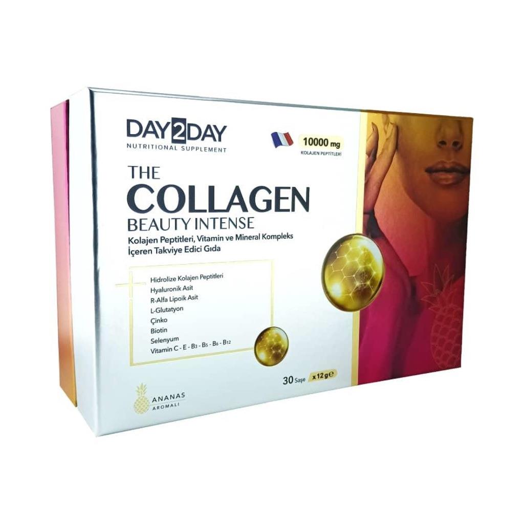 Day2Day The Collagen Beauty Intense 30 Saşe Ananas Aromalı 10.000 mg kolajenpeptit, R-alfa lipoik asit, glutatyon, hyaluronik asit, vitamin ve mineral kompleks içeren saşe formda gıda takviyesidir. Day2Day The Collagen Beauty Intense içerisinde sığır kaynaklı tip I kolajen bulunur. Molekül ağırlığı 2kda=2000 daltondur. Kolajen kaynağı helal sertifikalıdır. Day2Day The Collagen Beauty Intense ürünü glüten içermez. Saşe formdaki Day2Day The Collagen. Day2Day The Collagen Beauty Intense lezzetli içimiyle American Food Awards tarafından altın madalya tat ödülüne layık görülmüştür. Day2Day The Collagen Beauty Intense ilave şeker içermez. Tavsiye edilen günlük kullanım dozu; yetişkinler için günde 1 saşedir. Bir saşe, bir bardak suya (200 ml) ilave edilip karıştırılarak tüketilir.