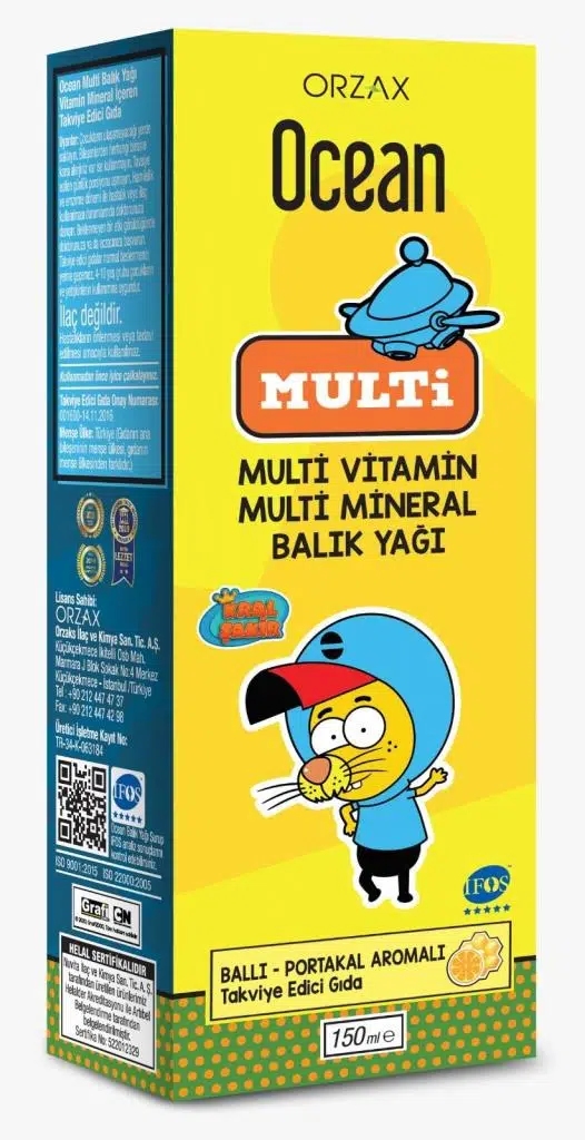 Doğal portakal konsantreli ve bal ilaveli Ocean Multi, çocukların fiziksel ve zihinsel gelişimi için günlük alınması gerekli olan multi vitamin, çinko ve Omega 3 desteği sağlar. Ocean Multi zengin vitamin mineral desteği ile çocukların iştahını düzenlemeye, bağışıklık sistemlerini desteklemeye, fiziksel büyüme ve gelişimlerine yardımcı olmaktadır. Ayrıca ağır metal ve diğer toksik bileşenlerden tamamen arındırılmış kaliteli Omega 3 desteği ile çocukların beyin, göz ve sinir sisteminin normal gelişimine destek sağlar.